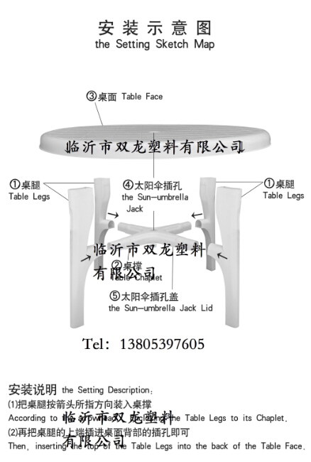 一般塑料桌椅,椅子是一次性注塑成型的不牽涉到組裝。桌子一般分為三部分、桌面、桌腿、桌撐。一個完整的塑料桌椅配件為一個桌面,一個桌撐,四條桌腿。一整套塑料桌椅又由一個桌子四把椅子組成。下附實物圖。
